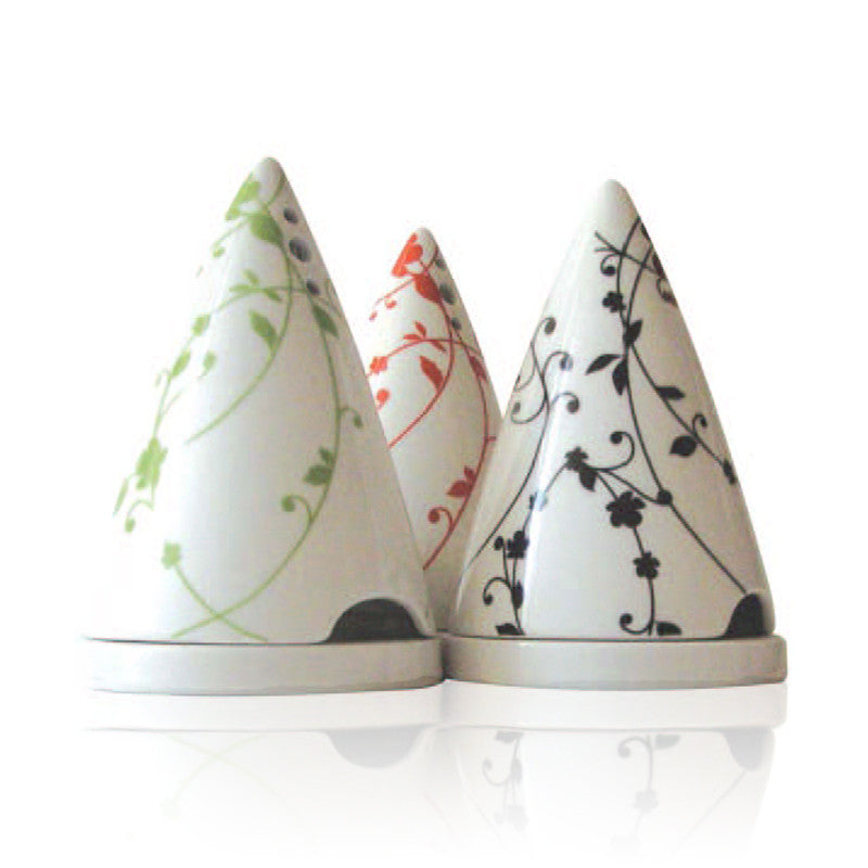 Put a pinch of aromatic wood powder on the small dish. Shape it into an half moon with your fingers. Light the top and keep burning for a few seconds, then gently blow the flame out and place the powder under the cover of the “Lutin” lamp. It will burn slowly and the smoke will adopt a decorative shape.