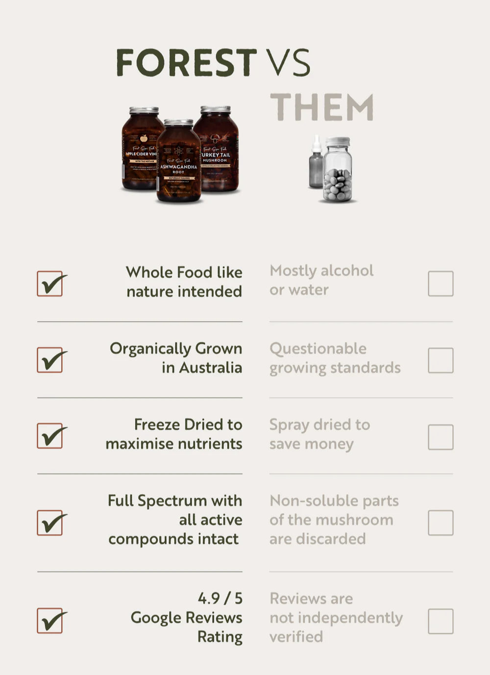 Superior drying process: Our Lion's Mane mushrooms are not just grown in the pollution-free Yarra Valley (Victoria); but they are also freeze dried in Victoria. Freeze drying is the most superior form of drying. It allows for a much more nutrient dense product that is almost identical to the fresh form of the mushroom. The cost is far greater and thus many imported Lion's Mane mushrooms are spray dried.