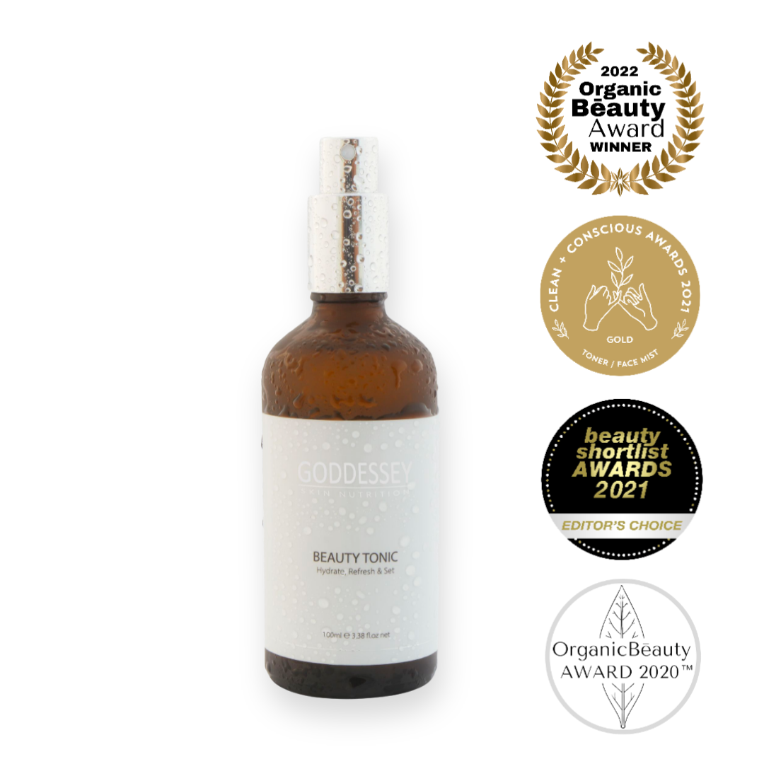 Goddessey Skin Nutrition - Beauty Tonic is a concentrated cleansing, refreshing & hydrating cocktail full of soothing and regenerating nutrient-dense ingredients. This is a true hero product to the natural makeup enthusiast It is multitasking and can be used to tone and prep the face before makeup application and may also be mixed with pigments and used to set and refresh the complexion.