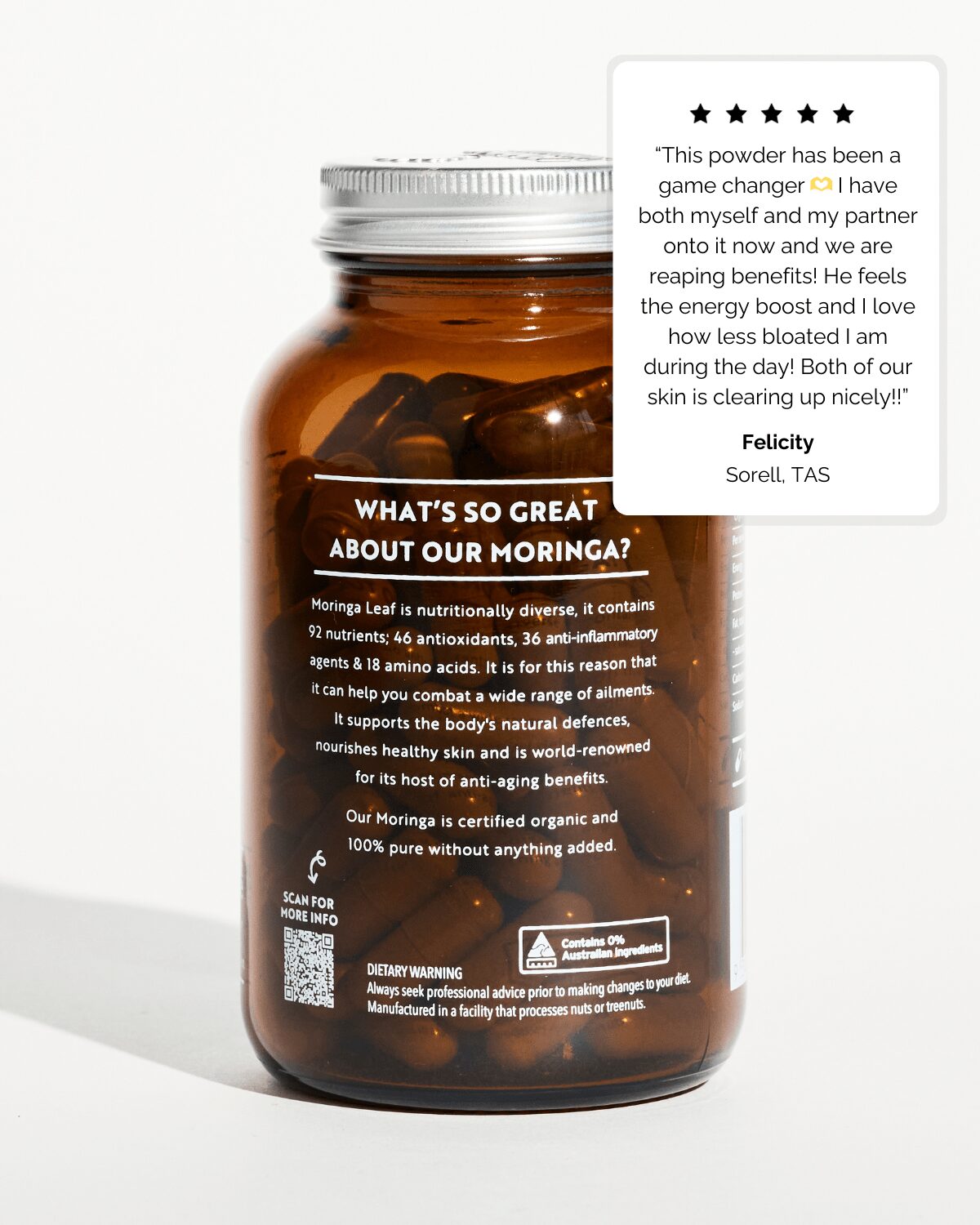 Moringa can be beneficial for a whole range of issues. It is incredibly nutrient dense, and contains 150% of the recommend intake of vitamin E in one serve, which contributes to cell protection from free radical damage.