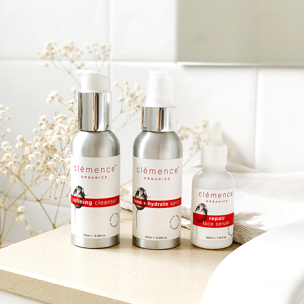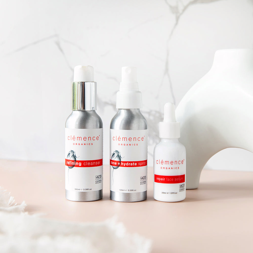 REFINING CLEANSER aloe barbadensis (aloe vera) leaf juice*, camellia oleifera (camellia) seed oil*, helianthus annuus (sunflower) oil*, glyerine*, cetearyl alcohol, arctostaphylos uva ursi (bearberry) leaf extract*, olea europaea (olive) fruit oil*, cetearyl glucoside, cetearyl olivate, sorbitan olivate, citrus sinensis (sweet orange) oil*, citrus aurantifolia (lime) oil*, pelargonium graveolens (geranium) oil*, pogostemon cablin (patchouli) oil*, canaga odorata (ylang ylang) flower oil*, rosa damascena.miller (rose otto) oil*, glyceryl caprylate, sodium levulinate, sodium anisate, phytic acid, bentonite, xanthan gum, acacia gum, *certified organic ingredient (87.06% certified organic ingredients, 100% natural ingredients) TONE + HYDRATE SPRITZ rose otto hydrosol super (bulgaria)* *certified organic ingredient (95% certified organic ingredients, 100% natural ingredients) REPAIR FACE SERUM rosa canina (rosehip) seed oil*, helianthus annuus (sunflower) oil*, calendula officinalis (calendula) extract*, simmondsia chinensis (jojoba) oil*, rosa damascena.miller (rose otto) oil*, citrus sinensis (sweet orange) oil*, citrus aurantifolia (lime) oil*, pelargonium graveolens (geranium) oil*, pogostemon cablin (patchouli) oil*, canaga odorata (ylang ylang) flower oil*, rosmarinus officinalis (rosemary) oil*, d-alpha-tocopherol (vitamin e) *certified organic ingredient (96.64% certified organic ingredients, 100% natural ingredients)