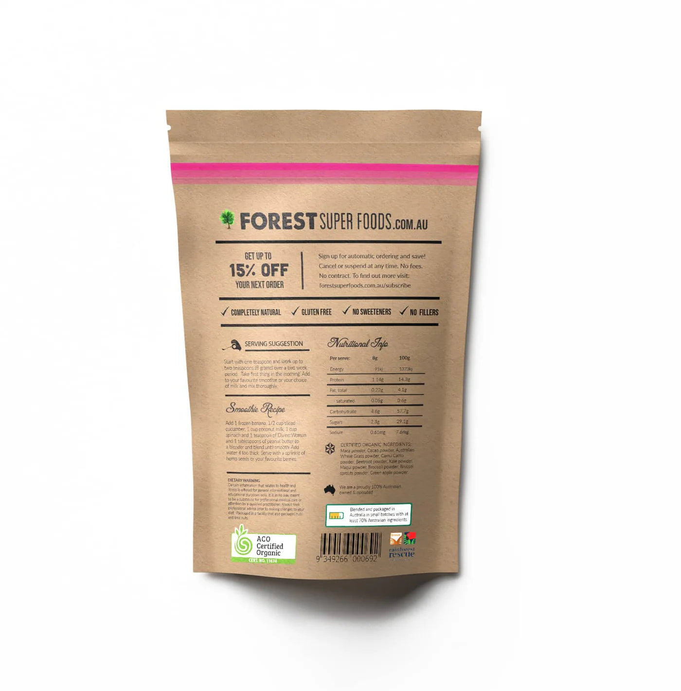 Ingredients: Maca root (Lepidium meyenii), Cacao bean (Theobroma cacao), Australian Wheat Grass (Triticum aestivum), Camu Camu Berry (Myrciaria dubia), Australian Beetroot (Beta vulgaris), Australian Kale (Brassica oleracea var. acephala), Maqui Berry (Aristotelia chilensis), Australian Broccoli (Brassica oleracea var. italica), Australian Brussel sprouts (Brassica oleracea var. gemmifera), Australian Green Apple (Malus domestica).