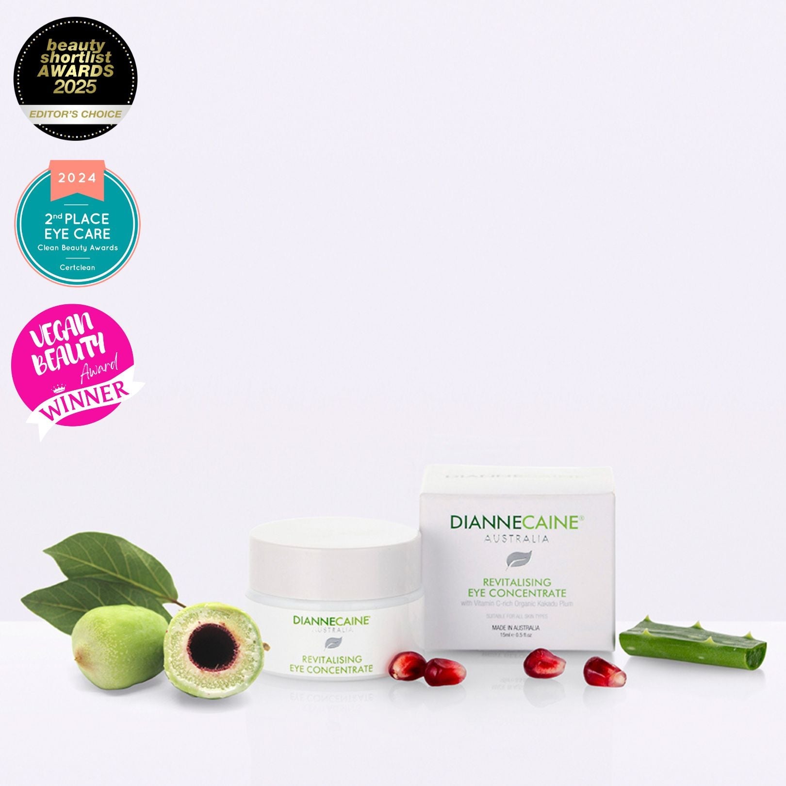 Formulated with a range of powerful organic and natural ingredients, including Bakuchiol, Hyaluronic Acid, Organic Kakadu Plum and Organic Cucumber Extract, Revitalising Eye Concentrate will help to reduce the appearance of fine lines and wrinkles, enhance skin radiance and luminosity, induce skin tone evenness and brighten the skin. Kakadu Plum, an antioxidant powerhouse and the world’s richest form of Vitamin C, targets the cause of premature ageing to maintain youthful skin around the eyes.