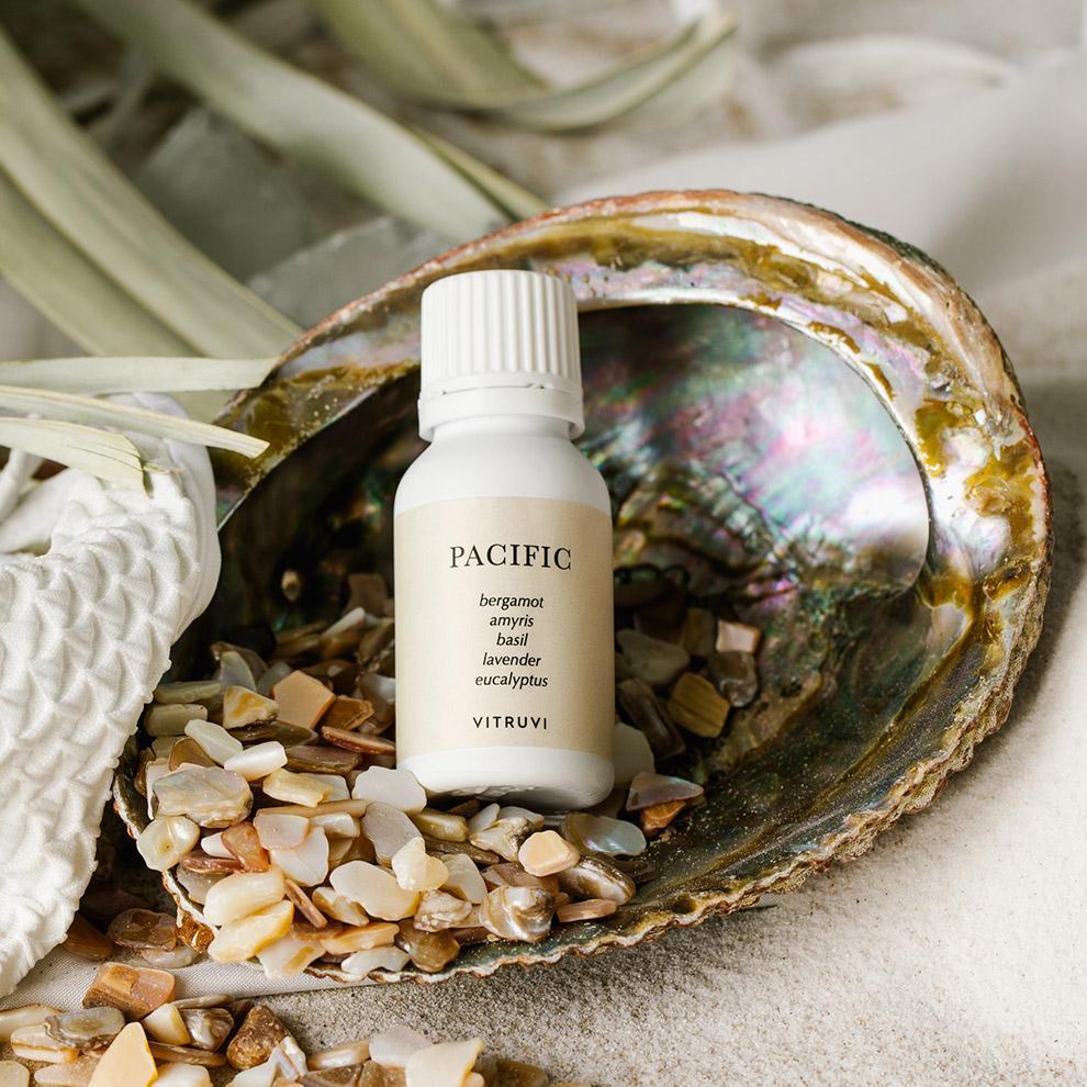 An ocean dip. Pacific is herbal and refreshing. With top notes of Amyris and Bergamot and bottom notes of Lavender and Eucalyptus, it smells like waves unfurling on the shore. Close your eyes, breathe in—you can almost feel the sand beneath your toes.