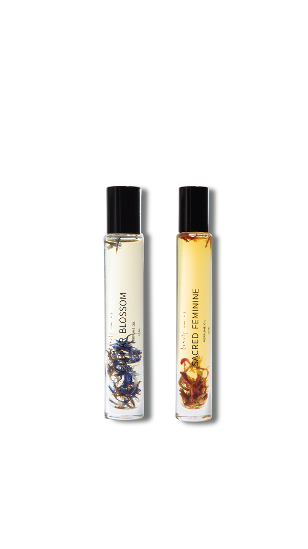 Elevate your self-care ritual with our luxurious perfume oils, blending the therapeutic benefits of aromatherapy with the elegance of natural perfumes. Both oils offer a multi-dimensional experience: wear them as natural perfumes to delight the senses or embrace their aromatherapeutic qualities to nurture emotional resilience support feminine hormones. Beautifully packaged in reusable organic cotton bags, this duo makes the perfect gift for those embracing their natural rhythms and feminine wisdom.