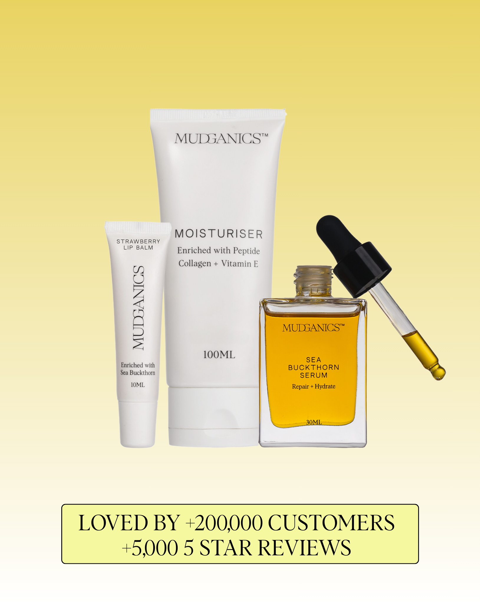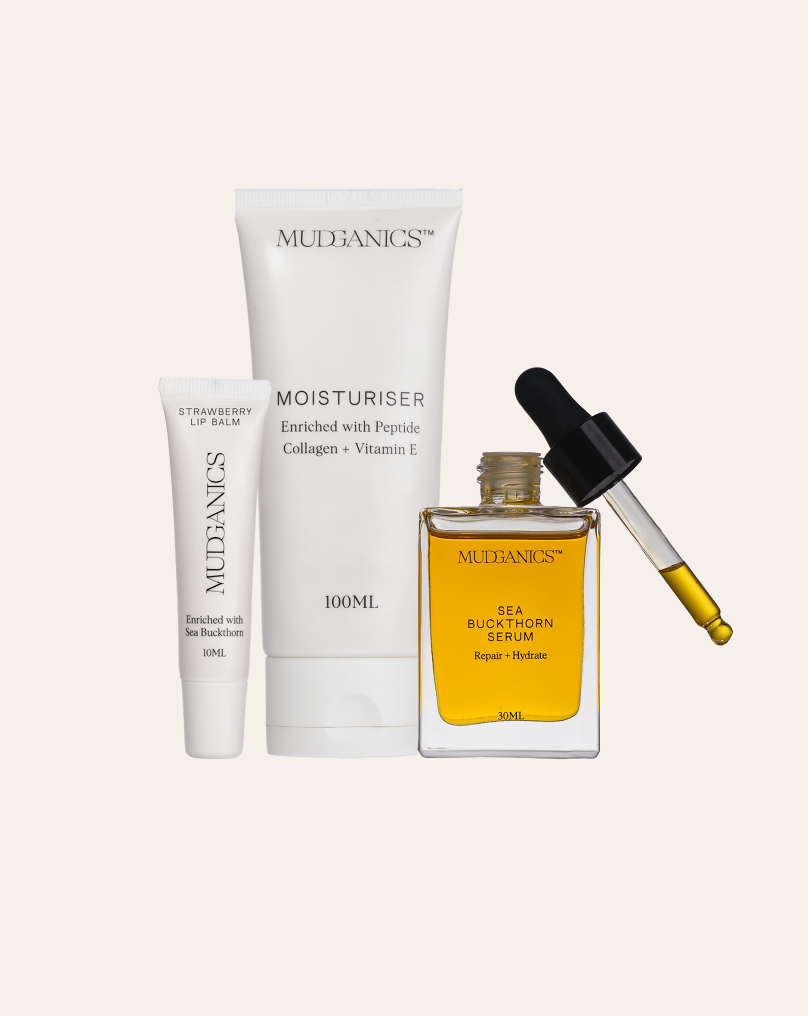The Ultra Hydrate Bundle is your go-to bundle for hydrated, healthy, and glowing skin. Featuring our Peptide Collagen Moisturiser, 30ml Sea Buckthorn Serum, and Sea Buckthorn Lip Balm, this trio harnesses the power of Sea Buckthorn in every product. Known for its rich concentration of omega fatty acids, antioxidants, and vitamins, Sea Buckthorn promotes deep hydration, enhances collagen production, and supports skin repair—giving you a radiant complexion and nourished lips every day.