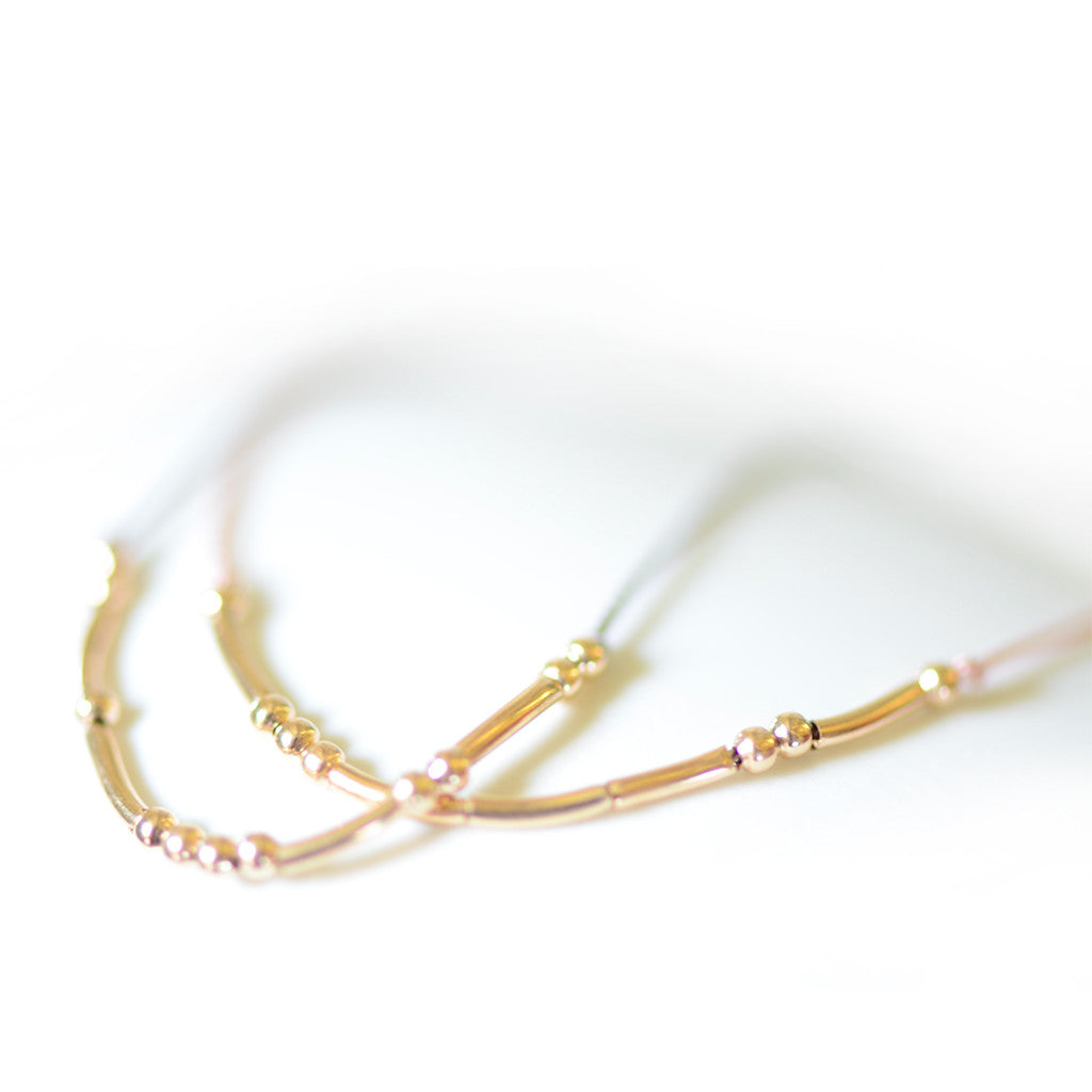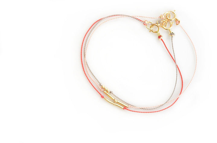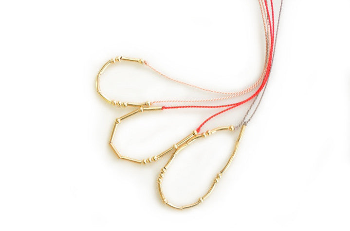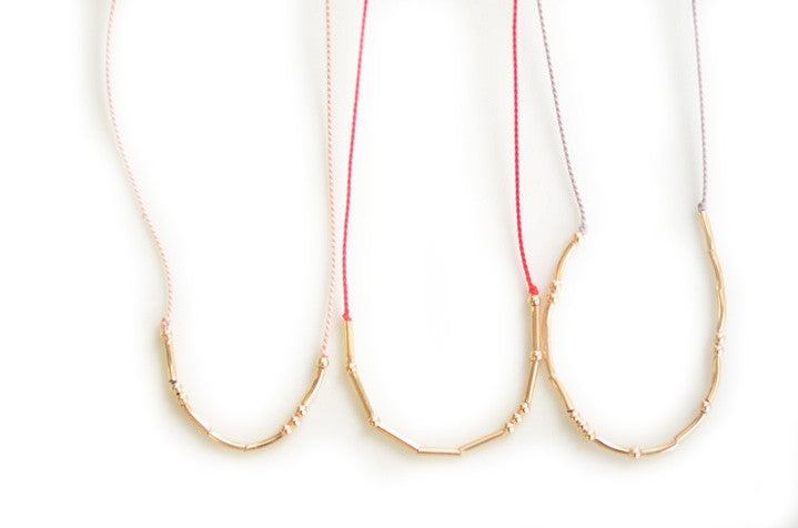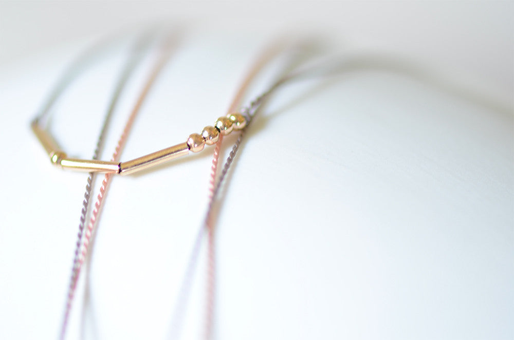 Dot, dot, dash, dash, modern and feminine morse coded necklace for you and yours is sleek and slender gold dots and dashes on an 18" coloured silk cord with a 5mm gold clasp.