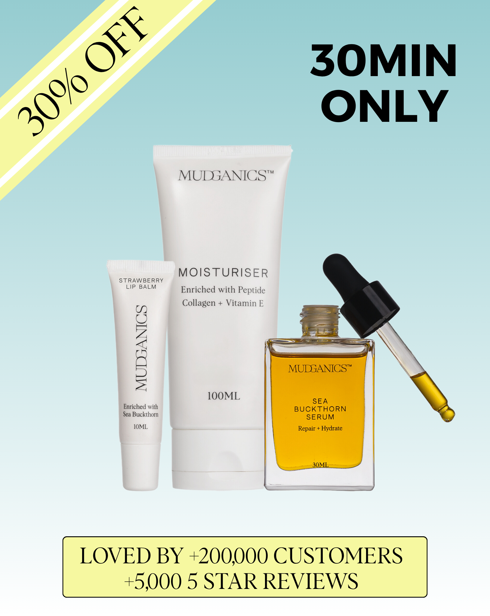 The Ultra Hydrate Bundle is your go-to bundle for hydrated, healthy, and glowing skin. Featuring our Peptide Collagen Moisturiser, 30ml Sea Buckthorn Serum, and Sea Buckthorn Lip Balm, this trio harnesses the power of Sea Buckthorn in every product. Known for its rich concentration of omega fatty acids, antioxidants, and vitamins, Sea Buckthorn promotes deep hydration, enhances collagen production, and supports skin repair—giving you a radiant complexion and nourished lips every day.