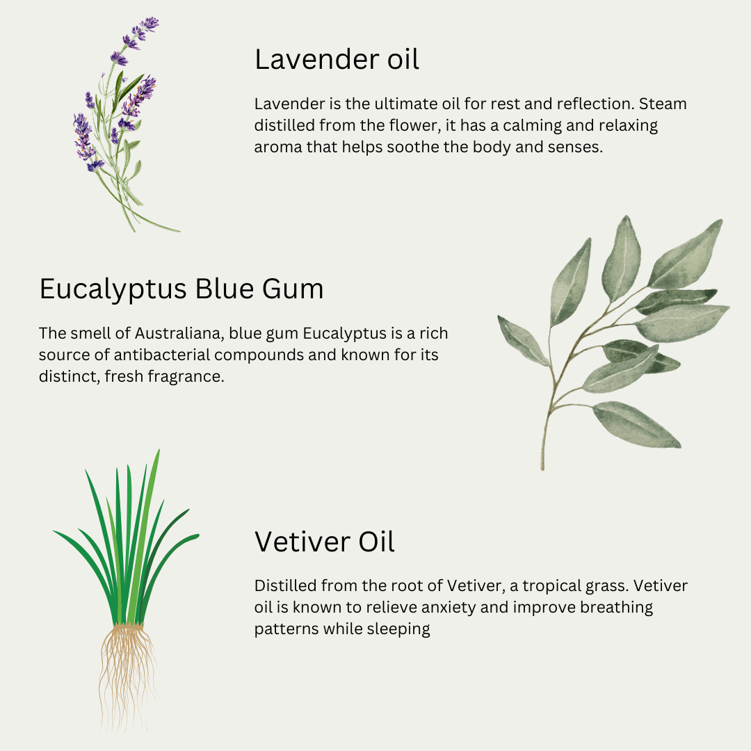Pure essential oil blend of Lavender and Indian Vetiver help you relax and get a good night’s sleep.