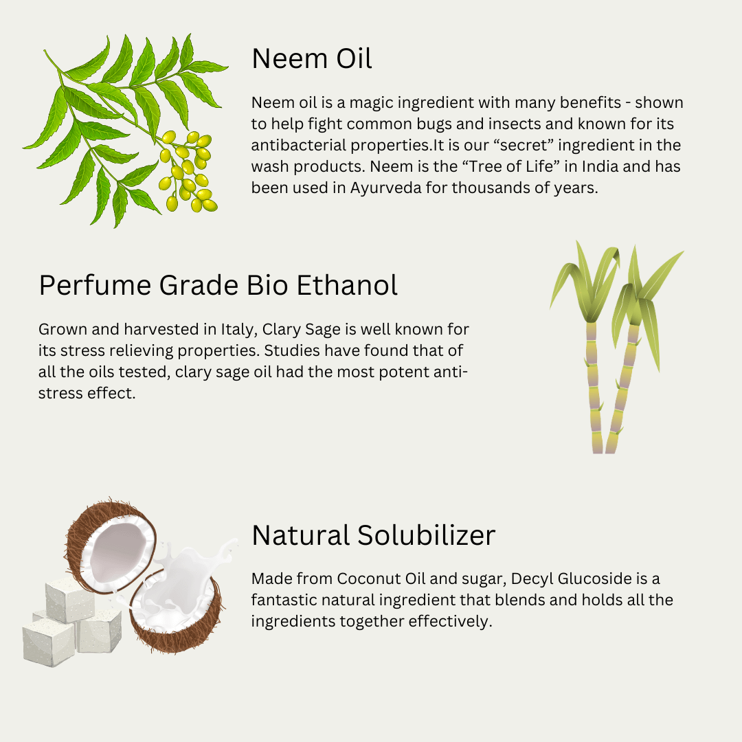 Helps to cleanse and disinfect linen in between washes with a powerful blend of pure essential oils, including Indian Neem and Australian Eucalyptus, known for their traditional disinfectant and bug-fighting properties.