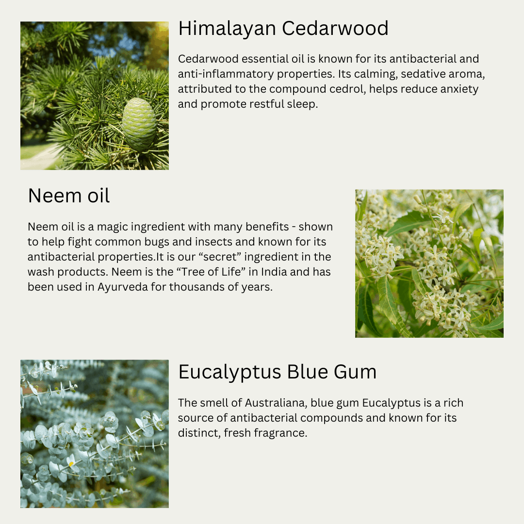 Helps to cleanse and disinfect linen in between washes with a powerful blend of pure essential oils, including Indian Neem and Australian Eucalyptus, known for their traditional disinfectant and bug-fighting properties.