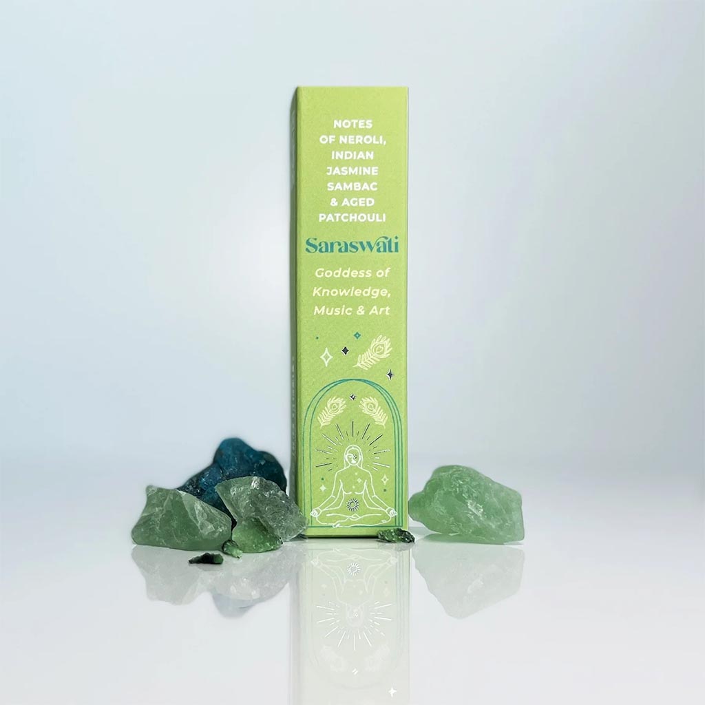 Saraswati contains Indian jasmine sambac to uplift and stimulate; Tunisian Neroli to relieve nerves and anxiety; and aged patchouli to fight depression.