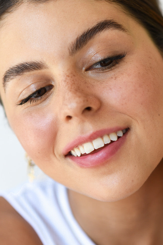 1. Dip wand into tube, wipe excess product on the rim and brush the applicator in short upward strokes from the inner corner of the brow to the outer corner to shape and build.